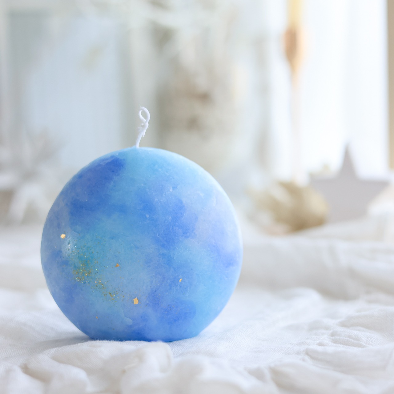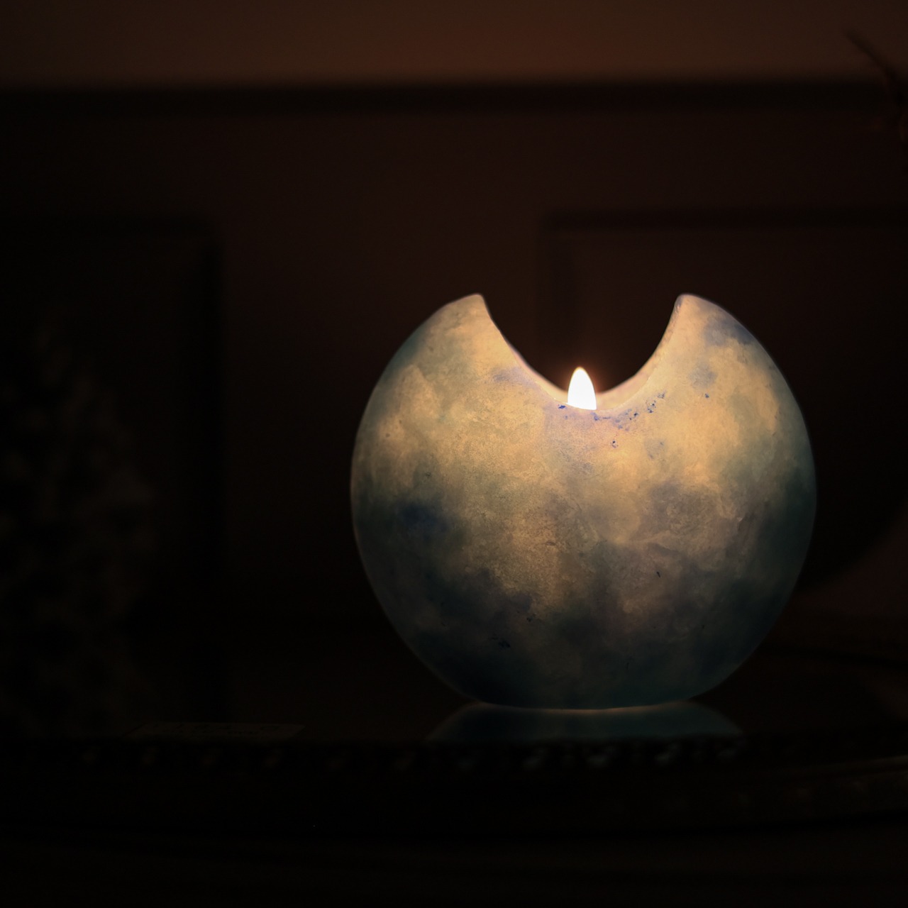 灯していくと月が満ち欠けのように溶けて、徐々に三日月型へとなっていきます。表面下部にはラメと箔をほんのりと散らしてあります。