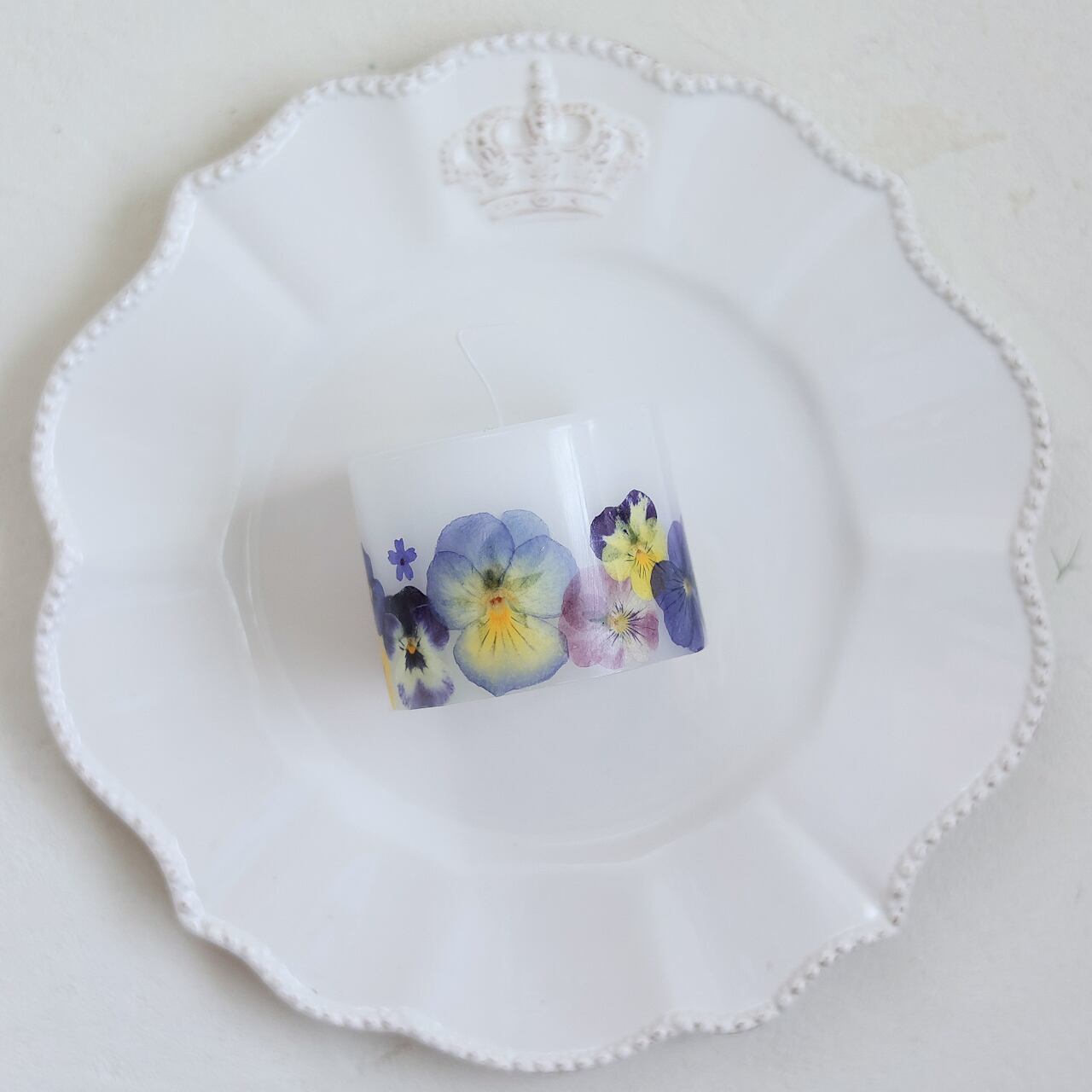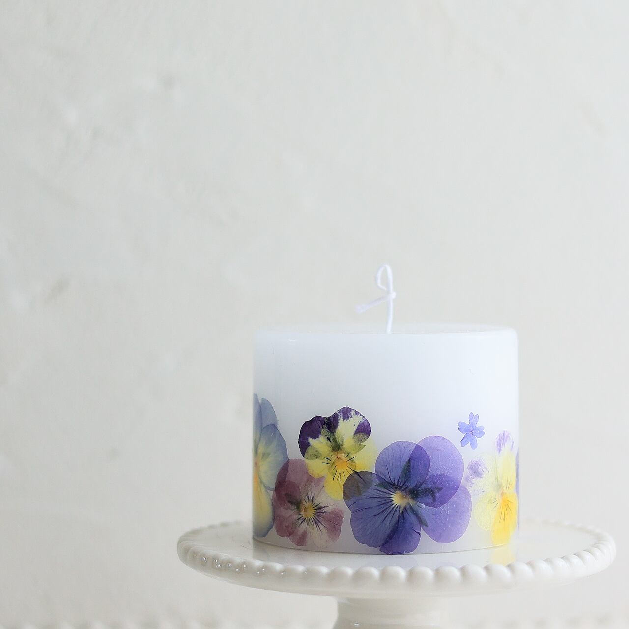 ビオラの押し花をとじ込めたボタニカルキャンドルです。