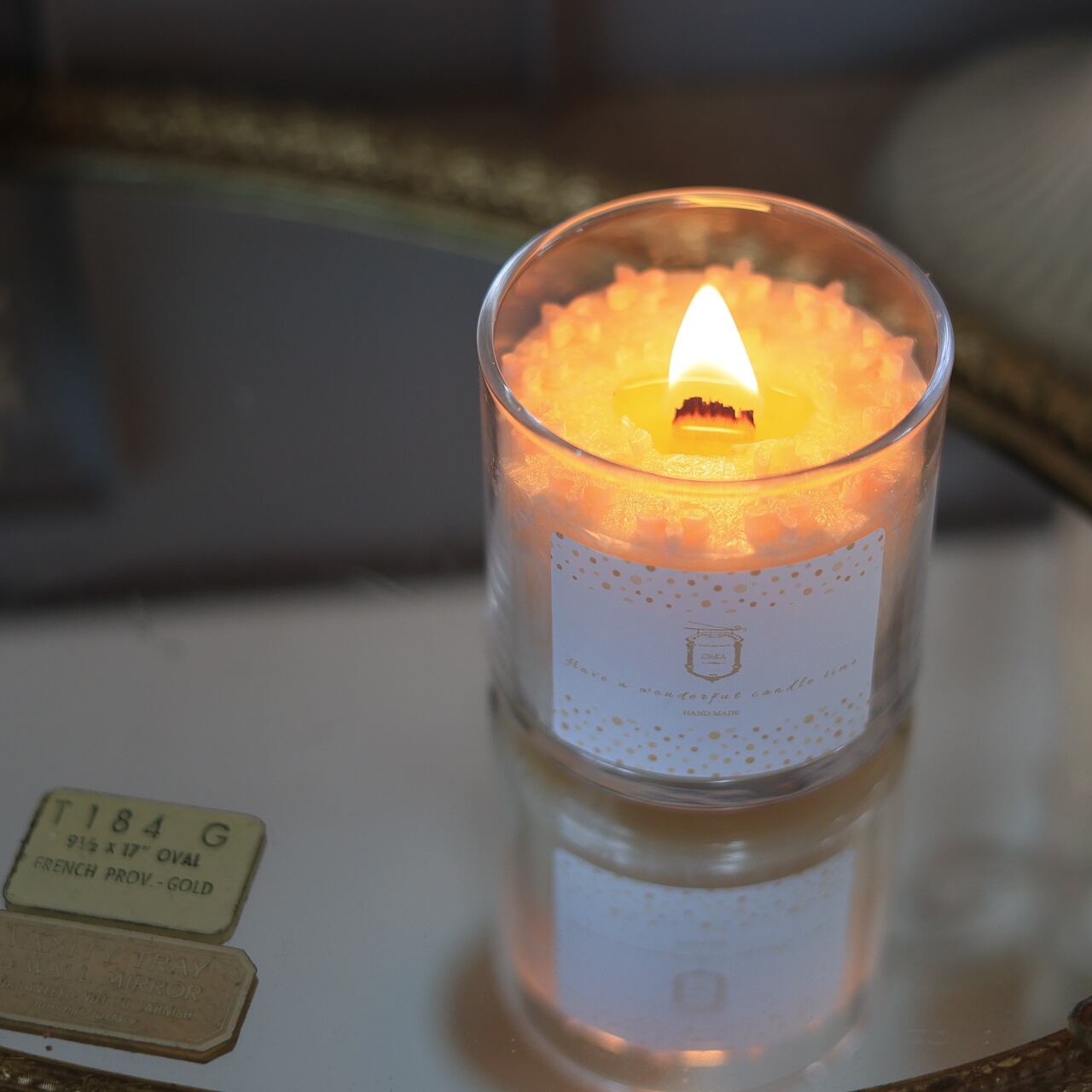 パームワックス特有のキラキラした結晶模様はお部屋のインテリアとして灯さず飾っても素敵ですが、火を灯していただくと結晶模様が浮かび上がったように見えとても幻想的です。