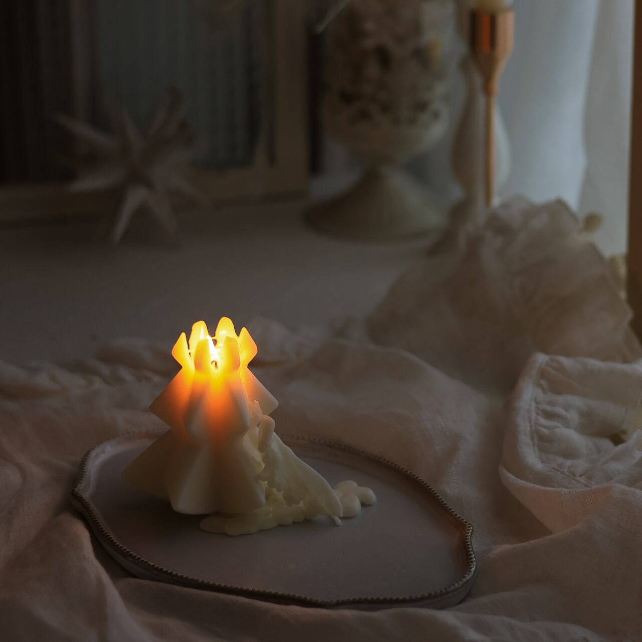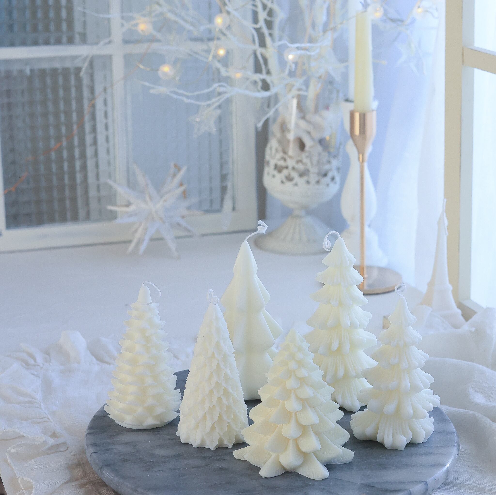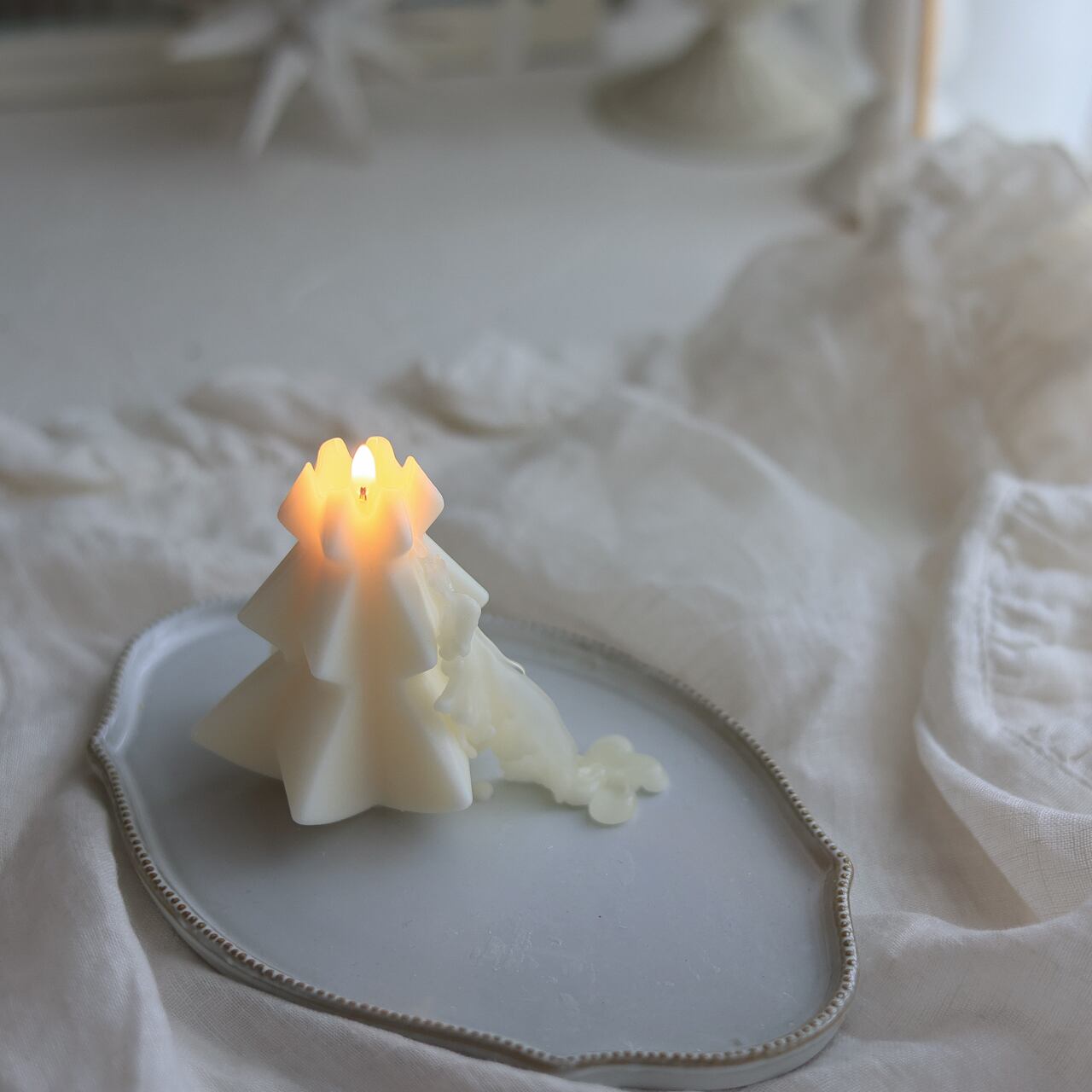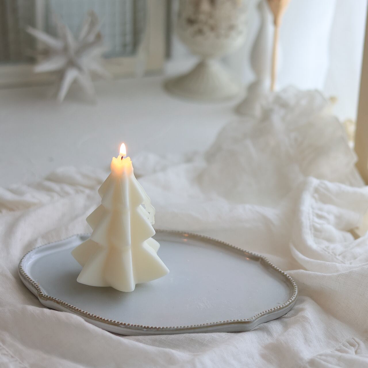 灯しても綺麗ですが、クリーミーなお色のソイワックスはインテリアとしてクリスマスのディスプレイにもぴったりです。