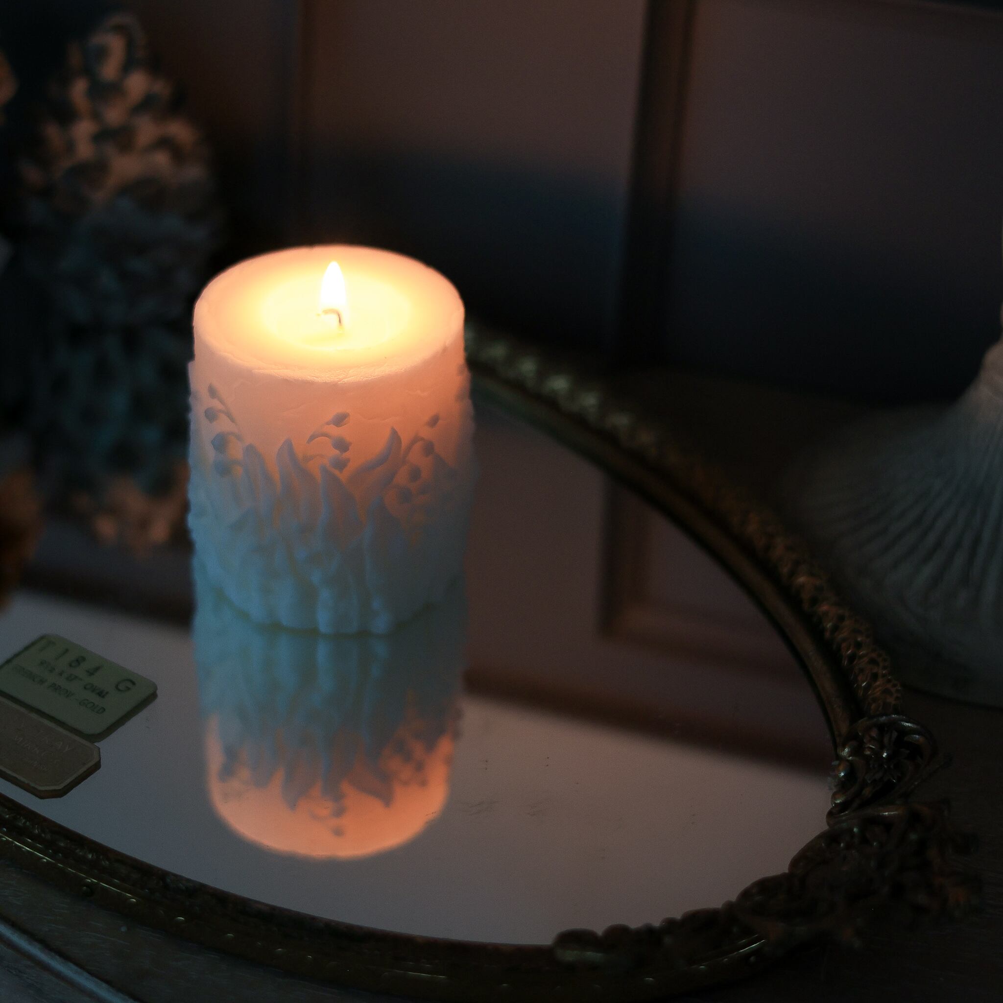 エンボスのように浮き出てているスズランがとても可愛いキャンドルです。